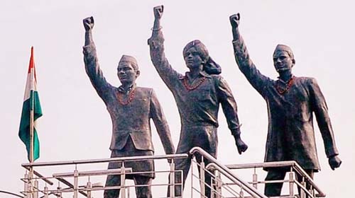 ਹੁਸੈਨੀਵਾਲਾ ਵਿਖੇ ਸਤਲੁਜ ਦਰਿਆ ਵਿਚ ਜਲ-ਪ੍ਰਵਾਹ ਕੀਤੀਆਂ ਅਸਥੀਆਂ ਵੀ ਤਾਂ ਇੱਕੋ ਧਾਰਾ ’ਚ ਵਹੀਆਂ ਸਨ! ਮਾਤਾ ਦੀਆਂ ਭਾਵਨਾਵਾਂ ਦੀ ਕਦਰ ਕਰਦਿਆਂ ਭਗਤ ਸਿੰਘ, ਸ਼ਿਵਰਾਮ ਰਾਜਗੁਰੂ ਅਤੇ ਸੁਖਦੇਵ ਦੀ ਤ੍ਰੈਮੂਰਤੀ ਚੌਕ-ਚੁਰਾਹਿਆਂ ਤੇ ਸੰਸਦ ਦਾ ਸ਼ਿੰਗਾਰ ਬਣੀ। ਜੋ ਮਰ ਕੇ ਵੀ ਨਹੀਂ ਮਰਦੇ, ਉਨ੍ਹਾਂ ਨੂੰ ਅਮਰ ਸ਼ਹੀਦ ਕਿਹਾ ਜਾਂਦਾ ਹੈ। ਇਸ ਲਈ ‘ਤੇਰੀ-ਮੇਰੀ ਇਕ ਜਿੰਦੜੀ’ ਦੇ ਮਹਾਤਮ ਨੂੰ ਧਿਆਨ ’ਚ ਰੱਖਿਆ ਜਾਵੇ। ਲੁਧਿਆਣਾ ਦੇ ਜਗਰਾਓਂ ਪੁਲ਼ ’ਤੇ ਹੱਥਾਂ ਵਿਚ ਕਿਤਾਬਾਂ ਫੜੀ ‘ਇਨਕਲਾਬ ਜ਼ਿੰਦਾਬਾਦ’ ਦਾ ਨਾਅਰਾ ਲਾਉਂਦੇ ਹੋਇਆਂ ਦਾ ਬੁੱਤ, ਮਕਬੂਲ ਬੁੱਤਘਾੜੇ ਅਵਤਾਰ ਸਿੰਘ ਨੇ ਰੂਹ ਨਾਲ ਬਣਾਇਆ ਸੀ। ਸ਼ਿਲਪਕਾਰ ਦੀਆਂ ਕਲਾਤਮਕ ਬਾਰੀਕੀਆਂ ਸਦਕਾ ਕਾਂਸੀ ਦੀ ਬਣੀ ਤ੍ਰੈਮੂਰਤੀ ਦੀ ਸਰੀਰਕ ਭਾਸ਼ਾ ਬਾਕਮਾਲ ਹੈ।